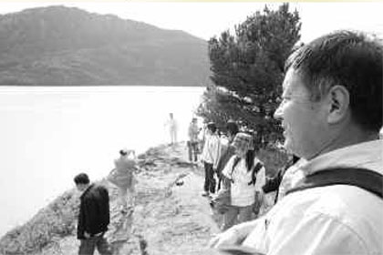 runt sjön, majoriteten är kineser. Turistbåtar kör
