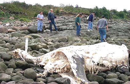 För några decennier sedan såg den lokala fiskaren James Longmire ett långhalsat djur i havet utanför Bay of Fundy. Det var en spegelblank dag i augusti månad och Longmire, som nu är 85 år gammal, hade gode vännen Harry Gregory med sig på fisketuren. "Det var långt ifrån oss men jag kunde ändå se huvudet", berättade Longmire. "Det påminde om huvudet på en häst. Bakom huvudet syntes en ganska stor rygg och hela djuret måste ha varit fyra till sex meter långt. Det verkade mycket större än vår båt, så vi visste inte om vi skulle våga stanna kvar... hela tiden betraktade det oss med sina stora, svarta, runda ögon". Den pensionerade fiskaren körde över till Parkers Cove så snart han hörde nyheten om kadavret, som spolats iland bara cirka 100 meter från det kommunalägda varvet. Kusligt utseende Den uppsvällda kroppen hade vad som föreföll att vara två stora simfötter framtill, en ryggfena och en lång, kraftig hals med ett förhållandevis litet huvud. Tomma ögonhålor stora som golfbollar gav kadavret ett i det närmaste kusligt utseende. En av de första akademikerna som kom till platsen var den pensionerade biologen Dave Tinker vid Toronto-universitetet. Han bor i närbelägna Granville Ferry och trots att han inte är någon expert på varken marina dägg djur eller fisk, gissade han att kadavret i själva verket var en starkt förruttnad brugd. "Underkäken är borta och har inte kunnat återfinnas", berättade han, samtidigt som han ingående granskade de illa åtgångna lämningarna. "Kadavret är starkt förruttnat just kring själva huvudet och det som framför allt avslöjar vad det är frågan om är avsaknaden av ben och tillgången på brosk. Det tyder på en haj och storleken talar för en brugd". Specialister En lokalinvånare skickade också digitala bilder till det statliga kanadensiska Fiskeriverket, som just samlat specialister på marina däggdjur till en konferens i Dartmouth för att diskutera rättvalar. Efter att ha studerat bilderna var de säkra på att kadavret var en brugd. ![]() När brugden ruttnar och käkarna faller av antar den ofta formen av ett sjöodjur. Alla experter vi konsulterat hittills är överens om att det handlar om lämningarna efter en brugd", sa Jerry Conway, samordnare för utrotningshotade marina däggdjur. "Brugden är vanligt förekommande i Bay of Fundy. Det handlar om stora djur som ofta misstolkas som valar. Det sätt på vilket det här exemplaret har ruttnat är typiskt för just brugden". Men dinosaurie-entusiasten Anthony Buccola var inte nöjd med den förklaringen. "Det är ingen brugd utan en korsning mellan en fisk och en ödla", deklarerade han från sitt hem i St. Croix Cove, två mil norr om Parkers Cove. Förföljde ett stim delfiner "Så snart jag såg djuret förstod jag att det inte var någon brugd", fortsatte Buccola, vars teckning liknar ett djur som vittnen säger förföljde ett stim delfiner för bara några månader sedan. "Det här djuret har ett huvud som på en häst". Han tror att det andades luft medan det fortfarande levde. "Det har lungor och en lever. Lungorna hänger ut på ena sidan, liksom hela tarmpaketet och många andra inre organ". Men enligt Steve Campana, som leder hajstudierna vid kanadensiska statens avdelning för fiske- och havsforskning, kan levern ha misstolkats som lungor eftersom en hajlever ofta är väldigt stor. Önsketänkande "Förruttnelsen är klassisk", fortsatte han och syftade på det sätt som hals- och stjärtvävnaden fallit bort, vilket exponerat halskotorna och kraniet. "Att det handlar om en strandad svanödla är förstås ett rent önsketänkande, men visst ser det så ut". "Så säger de alltid", kommenterade Anthony Buccola. "Det enda sättet att avgöra det här är att göra ett DNA-test på kadavret". Någon DNA-undersökning blev det nu inte, vilket vi på GUST tycker är väldigt svagt av de kanadensiska vetenskapsmännen. I synnerhet som en hel värld väntat på utslaget från Nova Scotia - sjöodjur eller inte sjöodjur? De berörda forskarna GUST mejlade då istället de berörda forskarna direkt och i ett svar av den 7 oktober, säger Dr. Chris Harvey vid Clark vid Dalhousie-universitetet i Halifax, Nova Scotia, följande: "Att påstå att jag leder undersökningarna kring hajkadavret i Parkers Cove är rent nonsens. Vad som hände var att media kontaktade mig och två andra experter och bad oss titta på ett videoband av kadavret. Ingen "rapport" är på gång om kadavret, i varje fall inte genom någon vetenskapsman jag känner till. Videobandet visade klart och tydligt att det handlade om en död brugd, som ruttnat på ett sådant sätt att den nu liknar den ökända s k sjöormen". Valexperten I ett annat email till GUST, daterat två dagar senare, skriver hajexperten Dr. Steven E. Campana vid Havsforskningsinstitutet i Dartmouth, Nova Scotia: "Ingen formell undersökning har gjorts av kadavret i Parkers Cove och således förbereds det ingen rapport om saken. Jag har kontaktats av ett stort antal människor sedan kadavret först hittades, så jag kan de flesta detaljer i fallet. Jag har också mottagit flera bilder med hög upplösning, som visar både kadavret och dess inre organ. Jag beslöt i ett tidigt skede att inte åka till platsen, eftersom jag är helt säker på att det handlar om en förruttnad brugd. Anledningen till att jag är så säker på det fördelar sig enligt följande: "Sjöormsutseende" 1) Kadavret är bokstavligen identiskt med den förväntade förruttnelsen hos en brugd. Det "sjöormsutseende" som en förruttnad brugd får har tidigare dokumenterats av företaget Scott and Scott's Atlantic Fishes of Canada, eftersom det är så extremt och spektakulärt. De har också bifogat en teckning av ett sådant kadaver från 1979, vilket matchar de bilder som nyligen publicerades i tidningen Chronicle Herald och som tagits av det nu aktuella kadavret i Parkers Cove. Företaget noterar också att dessa ka