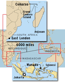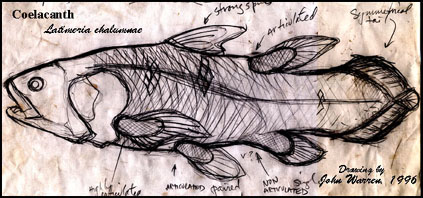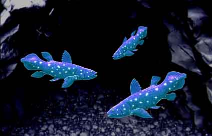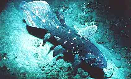 Generell beskrivning (och intressanta iakttagelser): Latimeria chalumnae är den kvastfening som hittades utanför Komorerna och coelacanth och Latimeria menadoensis är den indonesiska arten. Coelacanths ("see-la-kanths"). Latimeria chalumnae och Latimeria menadoensis är möjligen de enda överlevande representanterna för den tidigare utbredda familjen Sarcopterygian (fläskfenade kvastfeningar), av vilka det finns 120 kända arter i de fossila lämningarna. Resten av kvastfeningarna försvann under förintelsen i slutet av kritaperioden för 65 miljoner år sedan. Dagens kvastfeningar blir minst två meter långa och kan väga upp till 75 kilo (en jättelik hona i Mozambique var 180 cm lång och vägde 95 kilo), men vanligen är de mindre, särskilt hannarna, vilka inte blir längre än 165 centimeter. Kvastfeningarna är mörkblåa till färgen med distinkta vita fläckar, så speciella att forskarna kan se skillnaden på olika individer. Indonesiska exemplar tenderar att vara mer bruna än blå. Latimeria har en enda, stor, avlång och falsk lunga fylld med fett, ett linjärt hjärta, hajliknande inälvor med spiralvalv, och ett axiellt skelett som består av en ihålig brosktub som kallas "notocord". De har gångjärn i käkarna som gör att de kan sluka mycket stora byten. De har en mottagare i främre delen av huvudet som kallas snabelorganet. De är slemmigare än andra fiskar; och kroppen avger inte bara slem utan osar också av stora mängder olja. Forskarna tror att individuella kvastfeningar kan bli så gamla som 60 år. Kvastfeningen tycks vara en kusin till Eusthenopteron, den första fisk som anses ha använt ben för att ta sig iland - för 360 miljoner år sedan - och en föregångare till tetrapoderna (amfibier, reptiler och däggdjur), inklusive människan. Kvastfeningarna har en trilobitformad stjärtfena med en extra "snabel" och fena som sticker ut från mitten av den. Och till skillnad från den allmänna uppfattningen om de varit oförändrade under alla årmiljoner, har de utvecklats ytterligare på vägen och föder nu levande ungar. Lokaler (miljöer som de vistas i): Komorerna och Maputo, Mozambique; östra London och Sodwana, Sydafrika; norra Sulwesi (Bunaken National Park, Manado), Indonesien - kanske också världen i olika djuphålor. Kvastfeningarna samlas i undervattensgrottor på branta öar under dagtid och på djup som överstiger 100 meter. Deras vita fläckar mot ett koboltblått skinn ger dem ett utmärkt kamouflage bland vita svampdjur och ostronskal. Exemplar som har försetts med sonarsändare lämnade grottorna samma tid varje kväll på nattlig jakt efter föda längs kusten. Ätbeteende: De jagar vanliga bläckfiskar, tioarmade bläckfiskar, snipålar, mindre hajar, och andra fiskar som finns inom deras djuphavsrev och på vulkansluttningarna. Uppspårningen av bytet guidas troligen av det snabelliknande organet, som fungerar som en elektrisk mottagare. Latimeria är också känd för att kunna stå på huvudet, simma bakåt och med magen uppåtvänd, för att komma åt sitt byte. Forskarna misstänker att en orsak till att kvastfeningen är så framgångsrik (och så långlivad) är att den kan sakta ner sin metabolism när helst den vill, glida ner i de mindre bebodda djupen och minimera sitt näringsintag i ett slags dvalliknande tillstånd. Reproduktion: De är ovovivipariska, vilket betyder att äggen kläcks i samband med att de lämnar modern och de föder upp till 26 levande ungar vilka utvecklas från ägget i äggledaren, som tar näring från en stor s k gulesäck fram till födseln. ___________________________________________________________ Källor: Ett antal vetenskapliga sajter på nätet, t ex Dinofish.com, och Marine biology.com Översättning: Jan-Ove Sundberg, GUST © 2003.