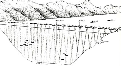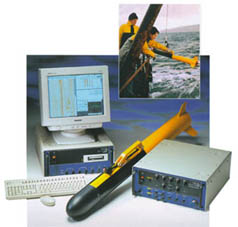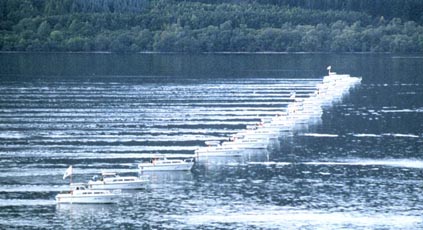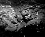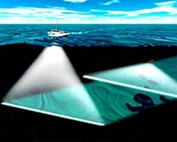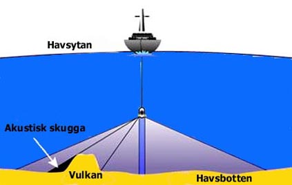 Människor som fiskar använder förenklade former av sonar som kallas djupmätare eller fiskfinnare (fishfinders), vilka berättar hur djupt det är på platsen. Denna apparatur kan även lokalisera fisken. En djupmätare skickar ut en puls, mäter den tid det tar att ta emot retursignalen och räknar sedan ut - med hjälp av ljudets hastighet i vatten, som är 1 500 meter per sekund - avståndet till objektet på havsbotten. Fotot av skärmen på en fiskfinnare (se vinjettbilden ovan) visar ett område där en båt just har passerat, och är 42 meter djupt. Bildåtergivningen är långtifrån lika bra som bilden från en sidoseende sonar, och visar: A) Ytstörningar som skapas av turbulensen kring givaren. B) Individuella fiskar. C) Ett fiskstim som rör sig över revet. D) Området kring revet; både stenar och den hårdare botten nedanför. E) Digitala avläsningar av djupet; vattentemperaturen och båtens fart. Sidoseende sonar Havsforskarna kan också använda en s k sidoseende sonar för attkartlägga undervattensberg och dalar, canyons och andra intressanta konturer på botten. ![]() En sidoseende sonar sänder mycket detaljerade "bilder" av objekt i vattnet och kan användas för att hitta fartygsvrak, minor, drunknade människor, etc. Den kan också användas till att inspektera pipelines, kablar eller brofundament, liksom att hitta intressanta geologiska formationer, t ex vulkaner (illustrationen här ovan). Om formationen på havsbotten är svårtolkad , och så är det faktiskt för det mesta, kan man ta hjälp av den s k akustiska skuggan och med den som bakgrund analysera sig fram till det som finns på den plats man är intresserad av. Allt det här är förstås mycket tidsödande och det ger fortfarande utrymme för helt olika tolkningar om vad man egentligen ser. "Sista söket med gänget" I augusti 2001 återvände amerikanen Robert Rines, nu 72 år, till Loch Ness för vad som beskrevs som ett månadslångt "sista söket med gänget". Dr. Rines blev världsberömd när han på 70-talet tog en rad spektakulära undervattensbilder av vad som sedan dess antas vara Nessie. Rines hade hjälp av sin son Justice och John P. Fish, Arnold Carr och Ann Janerico med flera från American Underwater Search and Survey. De använde en sidoseende sonar baserad på en teknik som lägger ut ett "akustiskt nät" över det objekt eller den plats man är intresserad av. Det akustiska nätet omfattade enligt uppgift hela den 4 mil långa,1 500 till 2 000 meter breda och uppemot 750 meter djupa Loch Ness. Sökutrustningen var en sidoseende sonar av märket Benthos SIS-1500 Chirp, som opererar med en s k svepfrekvens på 190-210 kHz och skapar en solfjädersformad, akustisk stråle (ca 0,5 grader i horisontalplanet och ca 55 grader i vertikalplanet) och som har en aktionsradie på mellan 25 och 750 meter per sida. ![]() Exempel på sidoseende sonarer i havet Båda sidor av sjön Genom att bogsera den s k "fisken" (givaren kallas så på fackspråk) på djup som varierade från 10 till 175 meter, i aktern på sökbåten "Morag", som kördes av skepparen Gordon Menzies från Drumnadrochit, kunde strålen nå båda sidor av sjön. Gapet som uppstod på grund av att detta var just en sidoseende sonar, täcktes med en konisk stråle av båtens egen fiskfinnare, en Furuno FCV663, med en frekvens på 48kHz. ![]() Utrustningen till en sidoseende sonar Expeditionen gjorde åtta vändor på den fyra mil långa sjön, från Loch End till Fort Augustus och tillbaka igen till basen i Urquhart Bay, men precis som GUST´s Operation CleanSweep några månader tidigare (april-maj), registrerades inga intressanta kontakter. Märkliga stenformationer Däremot fann Rines & Co. tecken på undervattensgrottor vid det s k hästskogrundet i södra delen av Loch Ness, där även GUST fann märkliga stenformationer. ![]() ![]() På 137 respektive 153 meters djup i Loch Ness fann Robert Rines och hans team märkliga klippformationer som ingen tidigare sett När Rines & Co. upptäckte "stora undervattensgrottor eller märkligt formade klippsprång på 153 meters djup vid hästskogrundet" skickade man ner en ROV (en kabelstyrd, propellerdriven sjöuggla försedd med videokamera) som sedan klättrade från 180 meters djup och upp till ytan, i vad expeditionsmedlemmarna senare beskrev som "ett Grand Canyon i miniatyr". Om det vilda landskapet på 137-153 meters djup betyder att där finns undervattensgrottor har man dock inte kunnat styrka, men uppenbarligen finns det geologiska förutsättningar för detta. Operation Deepscan ![]() Operation Deepscan var den största sonarundersökning som någonsin genomförts i Loch Ness. Den kostade 10 miljoner kronor och den som kläckte idén till den var Adrian Shine, ledare för Loch Ness-projektet. Han gick samman med Darrell Laurence, chef för Laurence Electronics i Tulsa Oklahoma, som ställde upp för publiciteten och reklamens skull. Försöken påbörjades i oktober 1986 då tio båtar försågs med Laurence X-16 sonarer. Utrustningen hade en räckvidd på 400 meter och kunde se objekt så små som 3 dm och som befann sig 2,5 cm ifrån varandra. Båtarna, som delvis sponsrades av Caley Cruises, utgick från Clansman Hotel och radade upp sig på en linje, men dåligt väder med hårda vindar upp till 15 meter per sekund stoppade sökflottan och vädret var så dåligt hela den sommaren att expeditionen fick ställas in helt. Största sonarundersökningen Den 9 oktober 1987, började så till sist den största sonarundersökningen som världen någonsin skådat. Båtarna var nu 24 till antalet och varje rastplats runt sjön vimlade av åskådare. Mer än 250 journalister och 20 TV-bolag var på plats och expeditionen kablades ut till en hel värld. Nitton båtar, samtliga utrustade med en Lowrance X16-sonar, bildade en solfjäder på sjön och rörde sig sedan sakta framåt anförda av Adrian Shines ledarbåt Atlantis, som var utrustad med en sonar från SIMRAD i Aberdeen (G