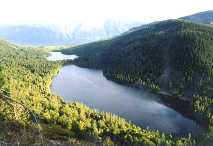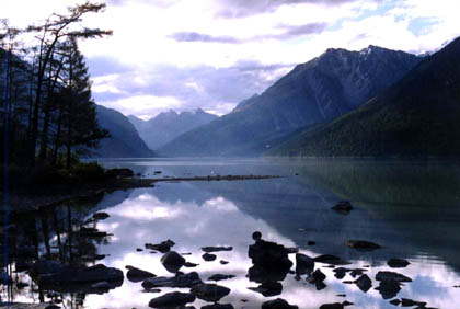 mycket om norska Seljordsvattnet, men bergen är högre och