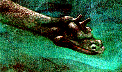 skissat upp ett ormliknande djur med stora ögon, 4-5 meter